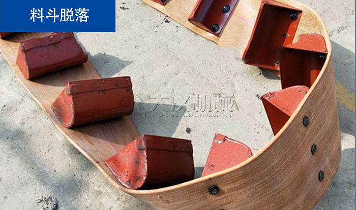料斗脫落是指在生產(chǎn)中,料斗從料斗帶上掉落的現(xiàn)象。料斗掉落時(shí),會(huì)產(chǎn)生異常的響聲,要及時(shí)的停機(jī)檢查,否則,將導(dǎo)致更多的料斗變形、脫落;在連接料斗的位置,料斗帶撕裂。
