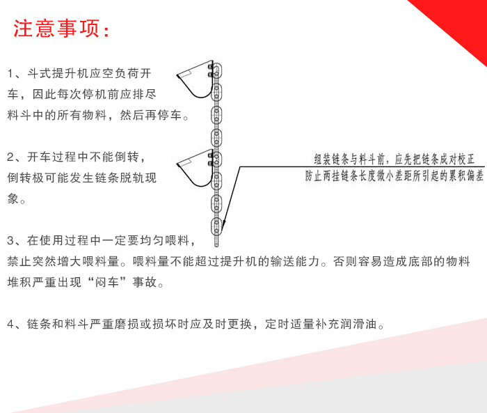 4、鏈條和料斗嚴重磨損或損壞時應及時更換,定時適量補充潤滑油。