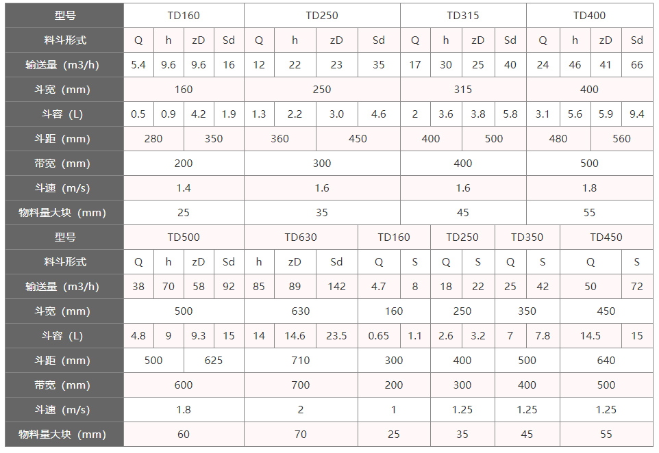 料斗:固定于膠帶(或牽引鏈)上,有三種:深斗(適合于松散物料),淺斗(黏性較大的物料),三角斗(比重大且成塊狀的物料)。